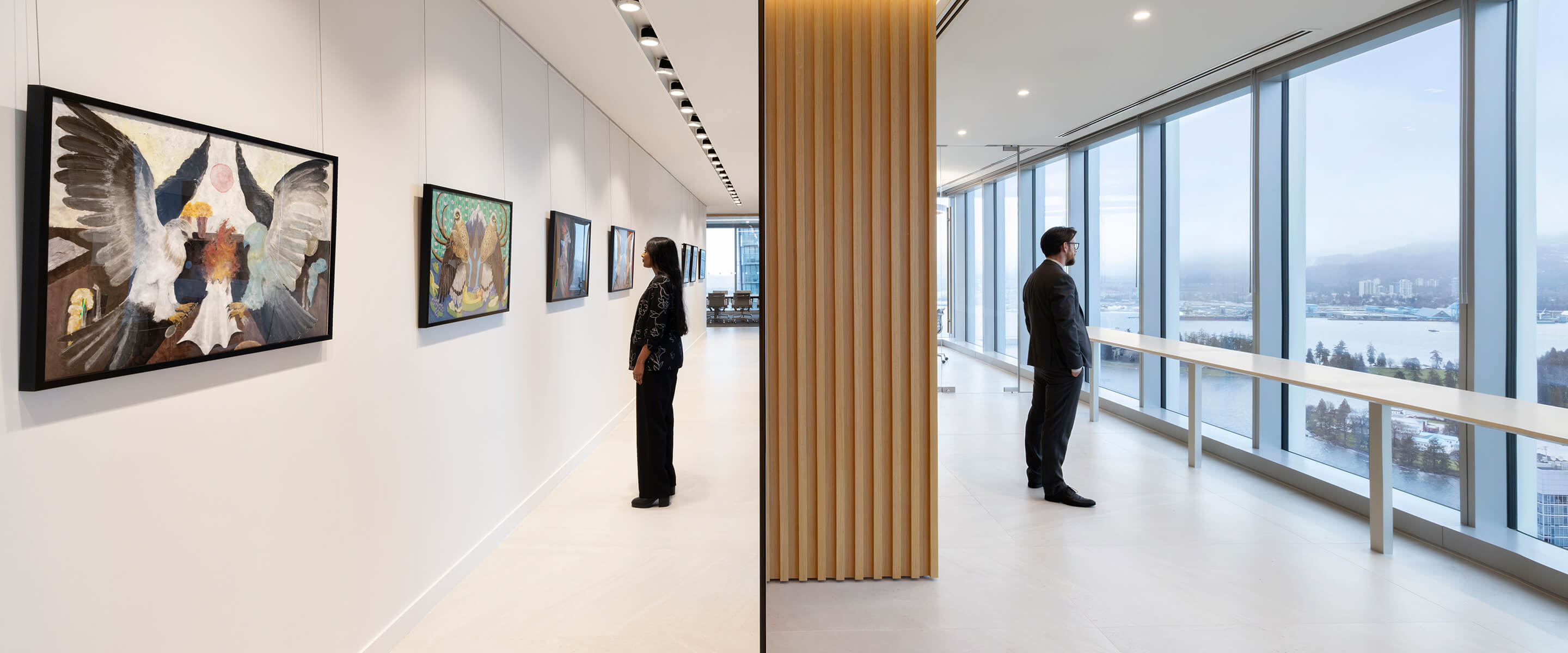 Office art gallery and city view through large windows.