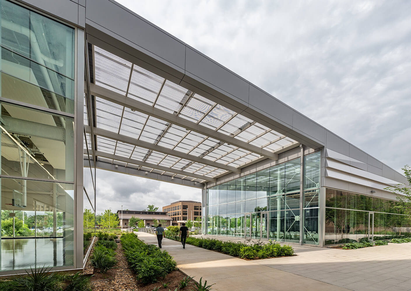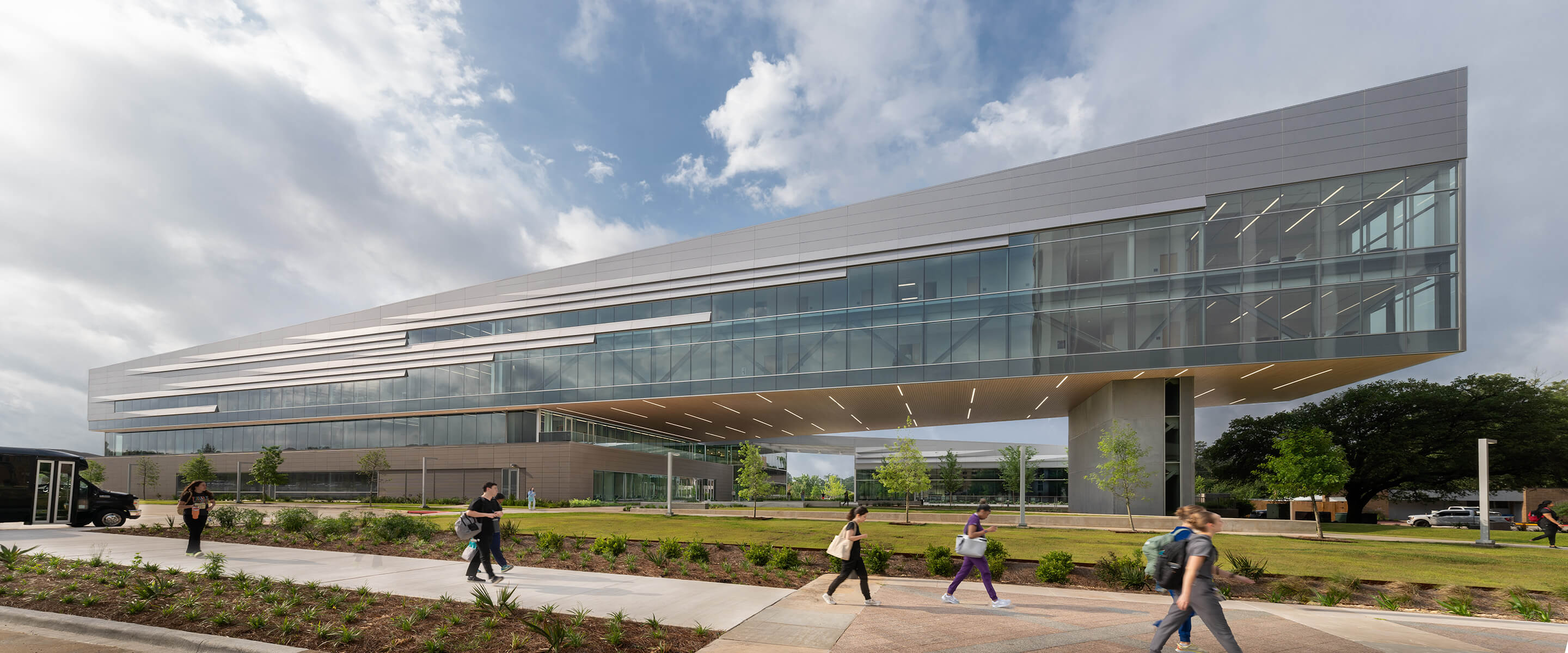 The dynamic form replaces a surface parking lot, energizing the campus core. Glass and metal emerge from a terracotta base, using transparency and lightness to transform the structure from bunker to beacon. This vitality matches that of the programs inside: research labs including an Emerging Viral Threats (EVT) lab, a unique classroom-in-the-round and other instructional spaces, clinical skills and simulation suites, plus a fitness center and student dining. Outside, the open and sheltered plaza and promenade offer all a warm welcome.