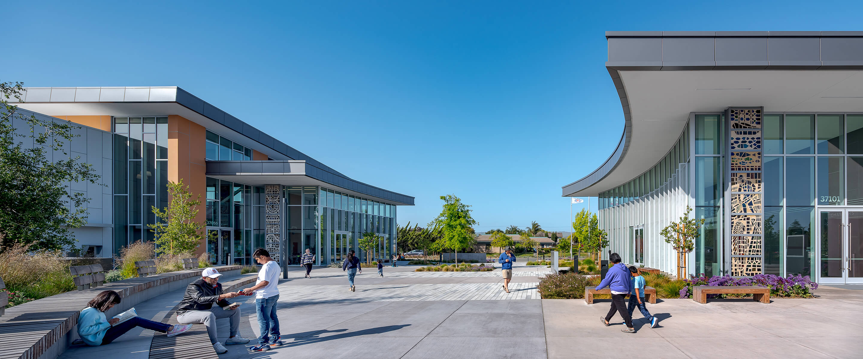 The three different buildings are centered by a plaza that serves as a multi-function public event space, evoking a distinct town center feel and creating a sense of community for Newark residents.