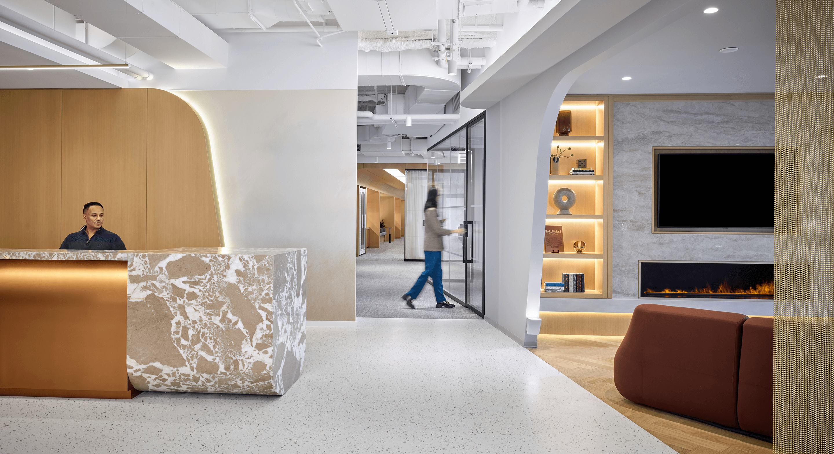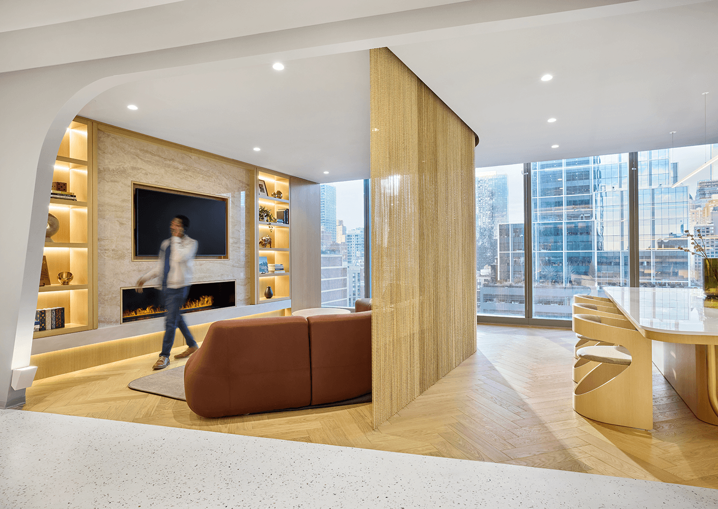 Living room-inspired breakout spaces, defined by a fireplace and elevated finishes, offer comfortable settings for conversation or pause. Reconfigurable conference and multipurpose rooms extend this approach, allowing spaces to adapt seamlessly to changing needs while maintaining a consistent, welcoming character.