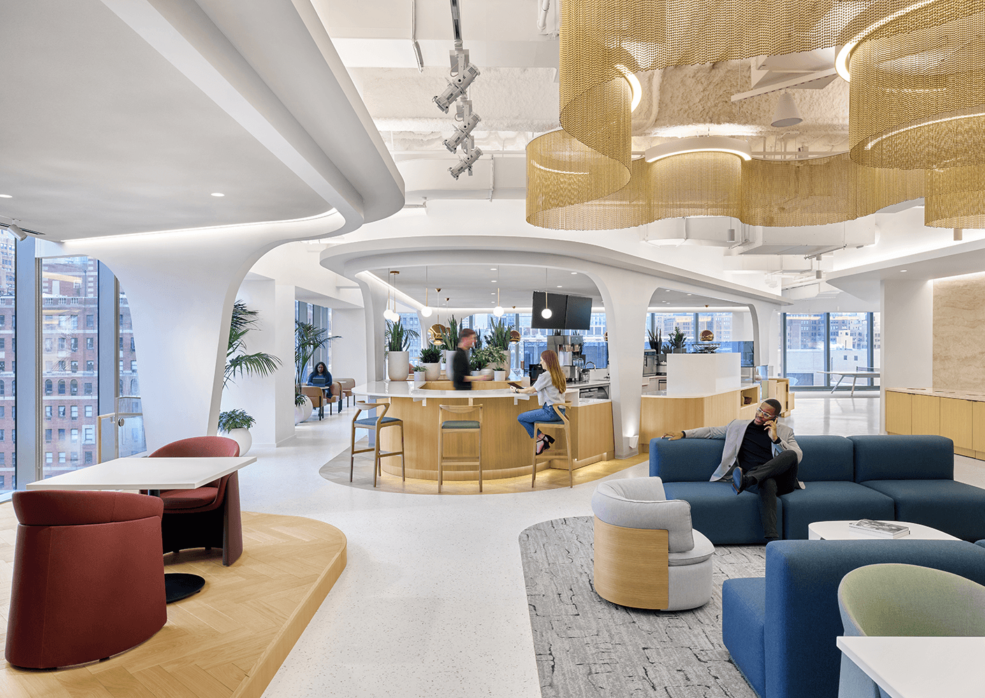 Guided by hospitality, inclusivity, and flexibility, the design supports a wide range of work styles while reinforcing shared values around wellbeing, diversity, and community. Sweeping organic forms, warm materiality, sculptural lighting, integrated planting, and abundant natural light establish a setting that is both expressive and restorative. Together, these elements position the workplace as a platform for ideas, connections, and culture.