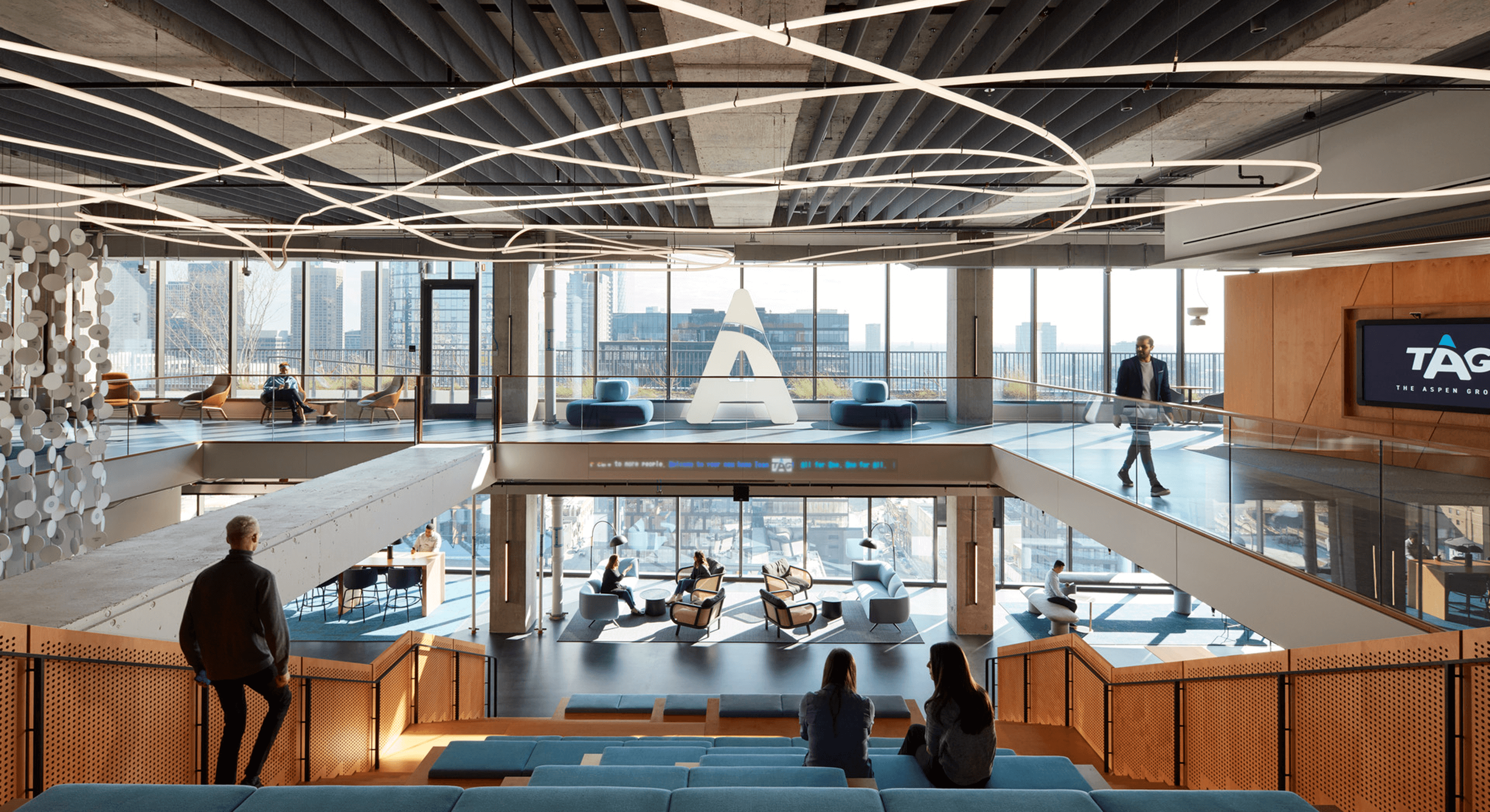 The headquarters’ material palette is a blend of Aspen’s brand identity and the industrial character of Chicago’s Fulton Market. Natural and stained blue plywood – a signature element – infuses warmth while subtly reinforcing Aspen’s recognizable blue. Felt baffles enhance acoustics while adding texture, and copper and black metal details provide contrast against the exposed concrete structure, creating a workplace that feels inviting, modern, and unmistakably Aspen.